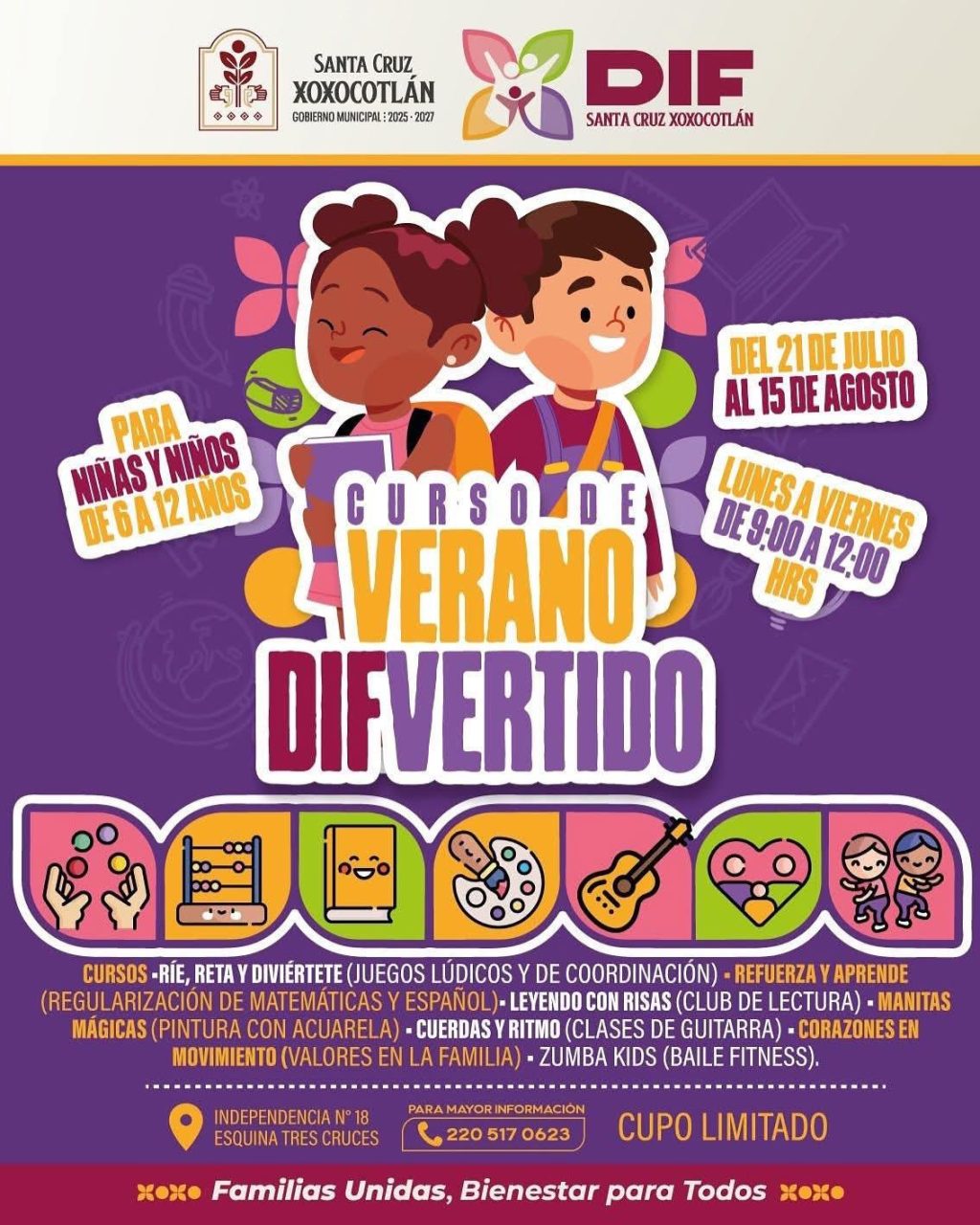 Con clases diarias, de lunes a viernes de 9:00 a 12:00 horas, este divertido programa impulsado por el DIF Municipal, se llevará a cabo del 21 de julio al 15 de agosto, en la calle Independencia 18, esquina Tres Cruces.