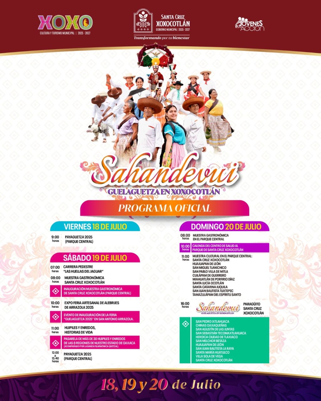 Bajo el impulso de la presidenta municipal, Nancy Benítez Zárate, el Ayuntamiento de Santa Cruz Xoxocotlán se complace en extenderles una cordial invitación a acompañarnos en nuestro programa oficial de festividades en el marco de la Guelaguetza 2025.