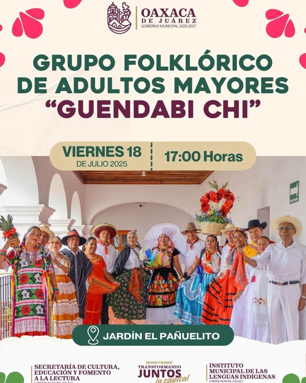 Este viernes 18 de julio inicia la cartelera artística con tres eventos imperdibles, a las 17:00 horas se presentará el grupo folklórico de adultos mayores “Guendabi Chi”. Una muestra de orgullo y preservación de nuestras raíces a través del talento de quienes mantienen viva la herencia cultural oaxaqueña.