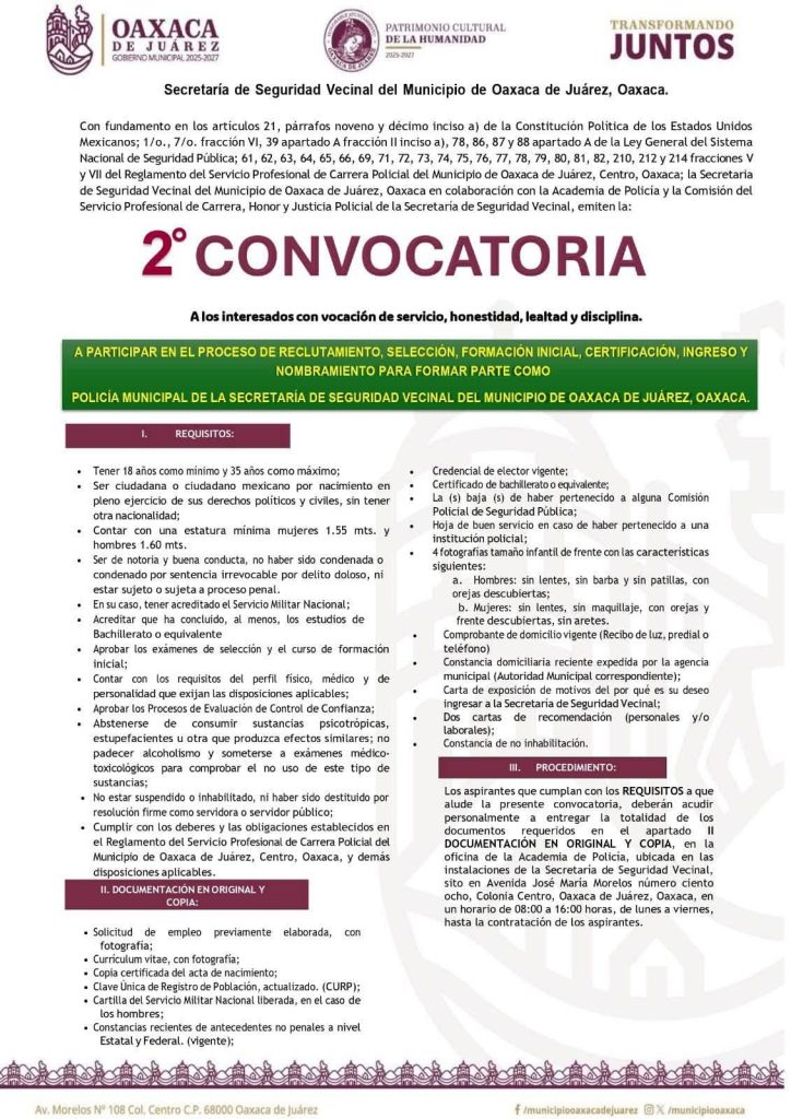Oaxaca de Juárez, Oax., 1 de agosto de 2025.- El Gobierno Municipal de Oaxaca de Juárez informa que la Segunda Convocatoria para formar parte de la Policía Municipal de la Secretaría de Seguridad Vecinal se amplía hasta el 30 de agosto de 2025. Esta decisión busca brindar más tiempo y facilitar la participación de personas interesadas en sumarse al servicio de seguridad pública con vocación, disciplina y compromiso.