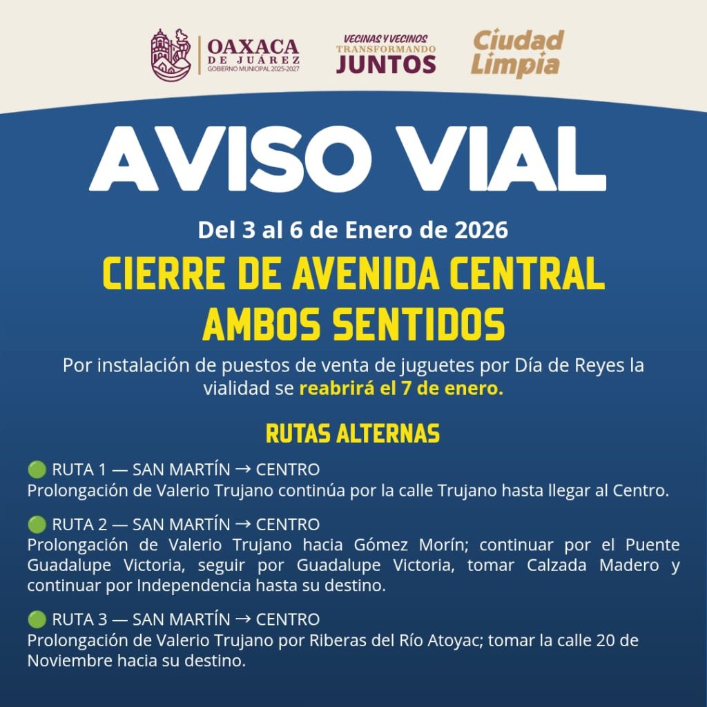 En este sentido, se informó que la Avenida Central se mantiene cerrada de manera temporal hasta el 7 de enero, por lo que se exhorta a la ciudadanía a utilizar vías alternas, las cuales se encuentran debidamente señalizadas. En el lugar, personal municipal brinda apoyo para orientar la circulación vehicular y peatonal.