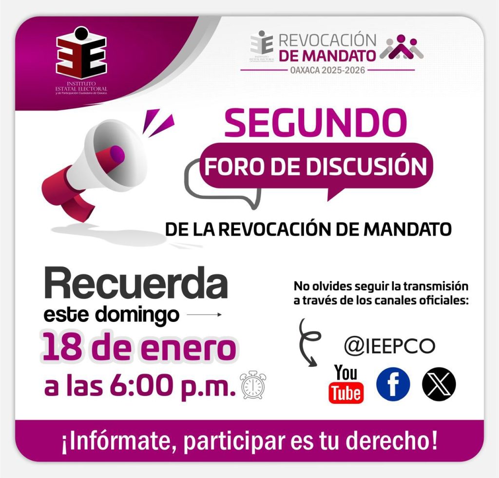 El Instituto Estatal Electoral y de Participación Ciudadana de Oaxaca (IEEPCO) realizará este domingo 18 de enero, a las 18:00 horas, a través de sus redes sociales institucionales, el Segundo Foro de Discusión sobre la Revocación de Mandato, como parte de las acciones para fomentar la participación ciudadana y el diálogo en torno a este ejercicio de democracia participativa.