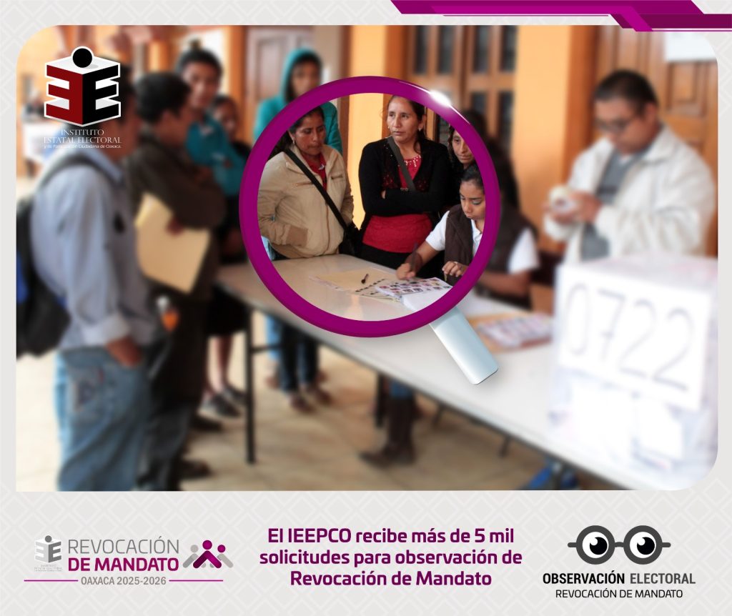 El Instituto Estatal Electoral y de Participación Ciudadana de Oaxaca (IEEPCO) informó que, al cierre de la Convocatoria para la Observación del Proceso de Revocación de Mandato de la persona titular de la Gubernatura del Estado de Oaxaca para el periodo constitucional 2022–2028, el Sistema de Registro de Observación Electoral (SIROBE) contabilizó un total de 5,590 solicitudes, de las cuales 5,011 fueron debidamente finalizadas y 579 quedaron inconclusas.