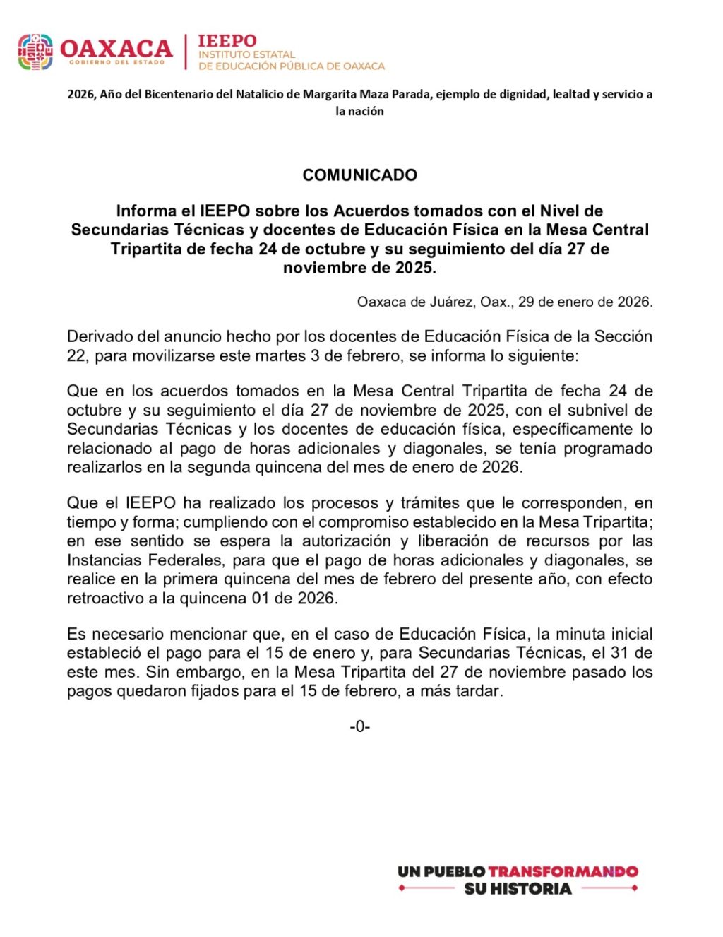 Que el IEEPO ha realizado los procesos y trámites que le corresponden, en tiempo y forma; cumpliendo con el compromiso establecido en la Mesa Tripartita; en ese sentido se espera la autorización y liberación de recursos por las Instancias Federales, para que el pago de horas adicionales y diagonales, se realice en la primera quincena del mes de febrero del presente año, con efecto retroactivo a la quincena 01 de 2026.