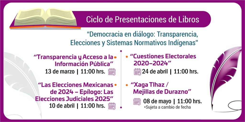 Como parte de este ciclo también se presentarán, en próximas fechas, los libros: “Las Elecciones Mexicanas de 2024. Epílogo: Las Elecciones Judiciales 2025”; “Cuestiones Electorales 2020-2024”; y “Xaga Tlhaz / Mejillas de Durazno”. Estas presentaciones brindarán una gran oportunidad para conocer, aprender y analizar sobre los temas abordados en las obras, a partir de las conversaciones enriquecedoras de las autoras y los autores.