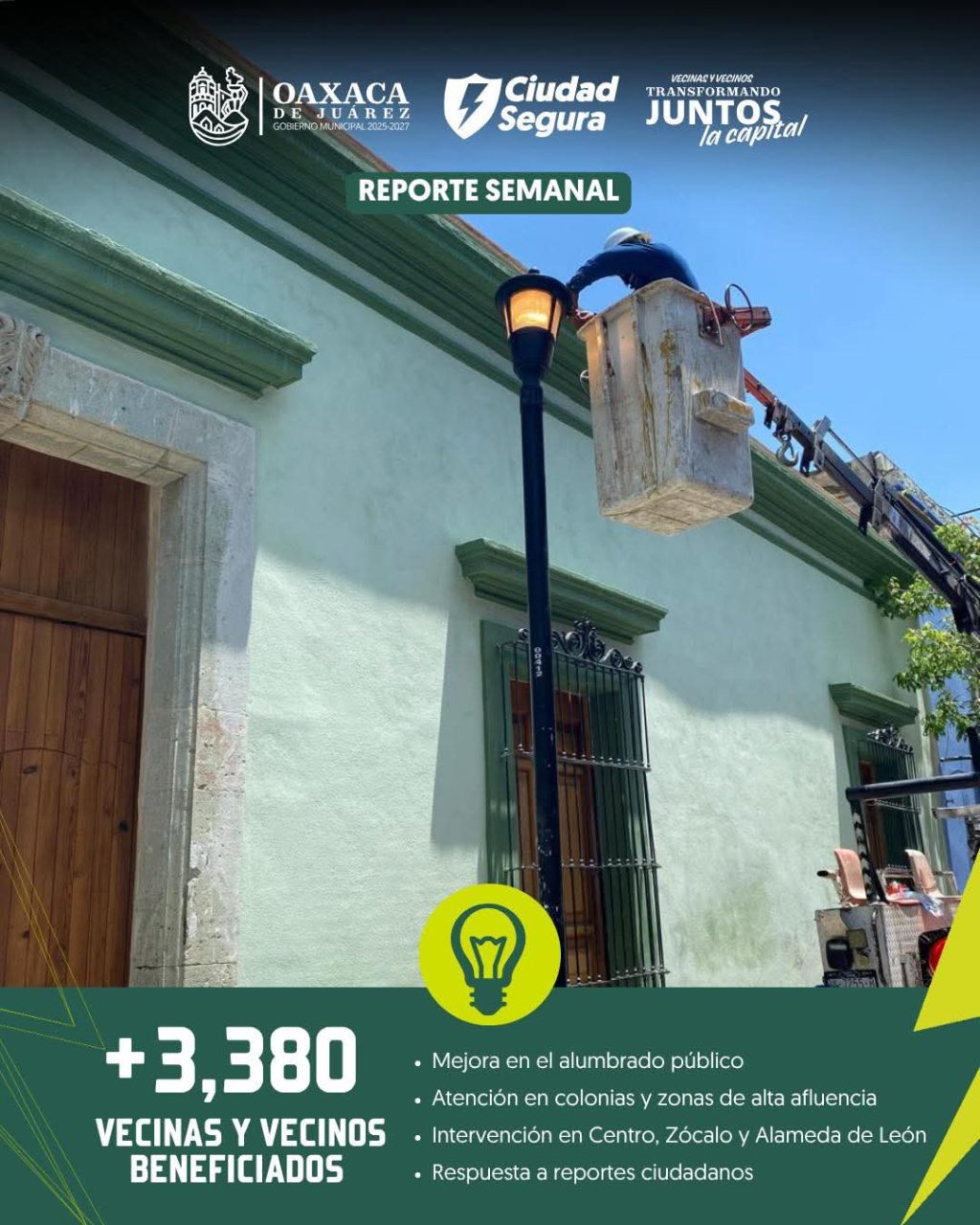 Durante esta semana el Gobierno Municipal de Oaxaca de Juárez que preside Ray Chagoya, realizó acciones en luminarias públicas que benefician a más de 3,000 vecinas y vecinos, mejorando la visibilidad y la seguridad en distintas zonas de la capital.