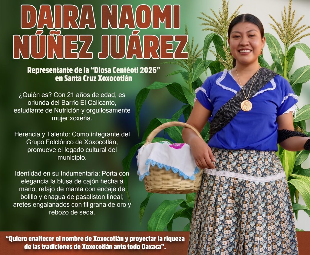 Daira Naomi Núñez Juárez fue elegida como representante oficial de Xoxocotlán para el certamen estatal “Diosa Centéotl 2026”.