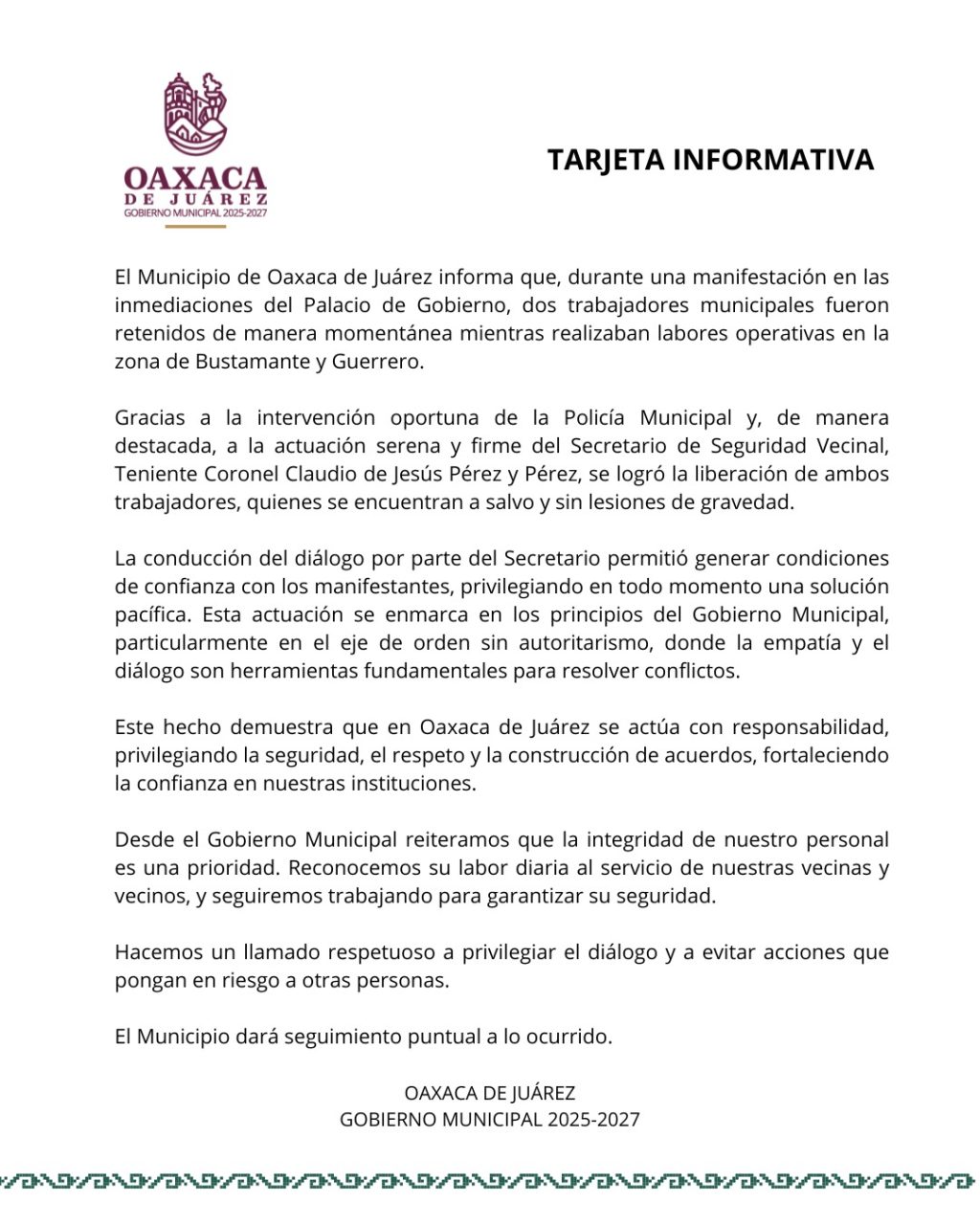 El Municipio de Oaxaca de Juárez informa que, durante una manifestación en las inmediaciones del Palacio de Gobierno, dos trabajadores municipales fueron retenidos de manera momentánea mientras realizaban labores operativas en la zona de Bustamante y Guerrero.