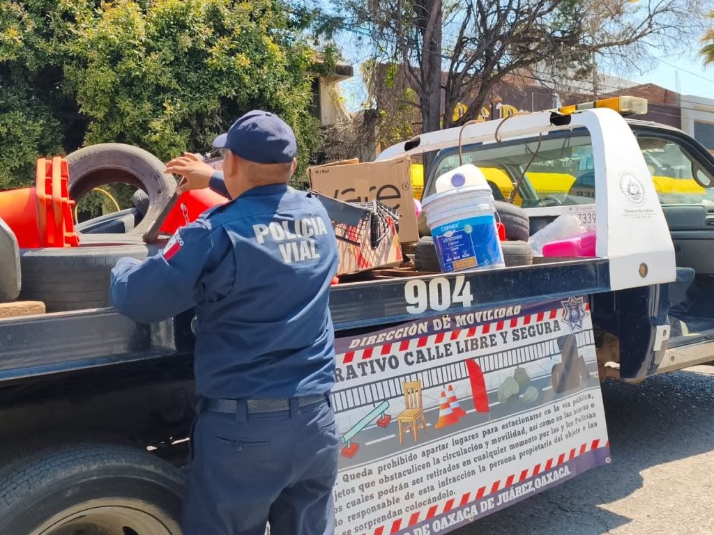 Personal de la Dirección de Movilidad de Oaxaca de Juárez retiró objetos que obstruían la vía pública y eran usados para apartar lugares de estacionamiento en la zona norte de la capital.