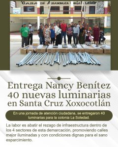 La presidenta municipal de Santa Cruz Xoxocotlán, Nancy Benítez Zárate, realizó la entrega de 40 nuevas luminarias destinadas a la...